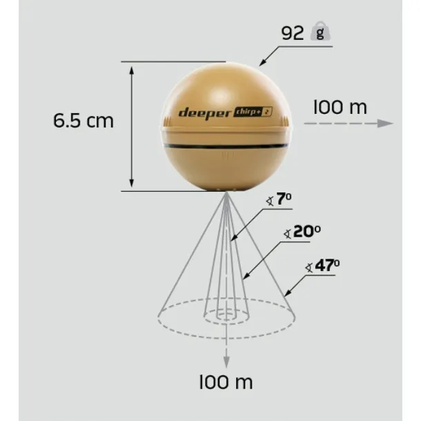 ✅ Typ echosondy: 3 częstotliwości CHIRP – wąski CHIRP 675 kHz (kąt stożka 7°), średni CHIRP 240 kHz (kąt stożka 20°), szeroki CHIRP 100 kHz (kąt stożka 47°)