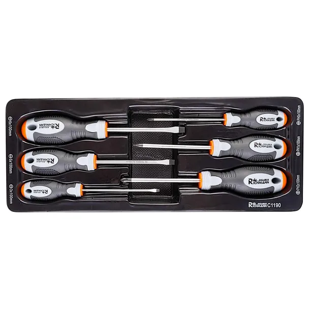 Zestaw 6 sztuk wkrętaków umieszczony we wkładzie do wózka warsztatowego typu A.