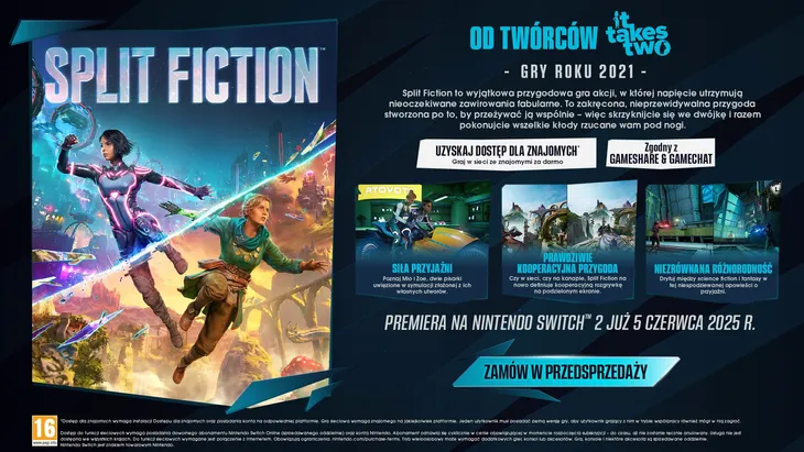 Daj się ponieść niewiarygodnym wrażeniom i zanurz się w różnorodnych światach Split Fiction, w których akcja, przygoda i współpraca przekraczają granice dzięki twórcom gry roku 2021 – It Takes Two. Mio i Zoe to dwie całkiem różne pisarki – jedna pisze science-fiction, druga fantasy. Zostały uwięzione we własnych historiach po podłączeniu do maszyny, której zadaniem jest kradzież ich pomysłów. Muszą na sobie polegać, by odzyskać wolność, zachowując swoje wspomnienia i współpracować, aby opanować różne umiejętności oraz pokonać różnorodne wyzwania, przeskakując między światami science fiction i fantasy w tej nieoczywistej opowieści o przyjaźni.